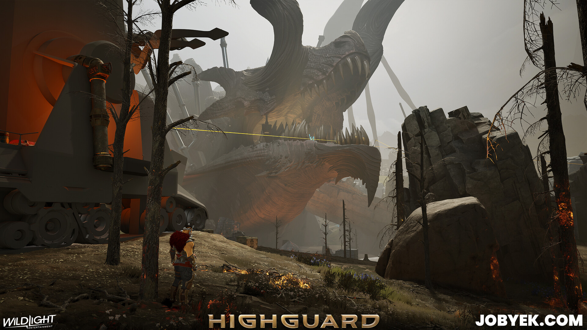 With permission from Wildlight, we're allowed to show WIP future content we were working on. Map 7 was going to be a special one. A crashed blimp, an epic felled dragon, a scorched and wartorn battlefield inspired by WW1. I'm sad I won't get to finish this open-world landscape, it was shaping up to be a fun one to work on with a lot of built-in environment storytelling embedded into the landscape and very different and less 'cheery' than our other maps. These shots are as WIP as it gets and a glimpse into how things look while in heavy development before any polish is applied - this is somewhere between art blockout and before our propagation phase starts where we start propagating near final assets (that we created during the style creation phase, which we were in the middle of). That's where we start bringing the whole map together across POIs, landscape, etc. During the art blockout phase, I went back and forth with the Map’s Designer Alex Graner on refining compositions across the map along the main roads to get multiple opportunities to get good views on the dragon, the crashed blimp, etc. That was also when the initial pass on the different biomes painting was done (lush lupine biome, burnt biome, etc.). I was close to finalizing the burnt biome before we got news of the layoff - the burnt tree set was close to final and destructible, scorched ground material layers were tuned up, ground debris/grass types were created and set up, etc.